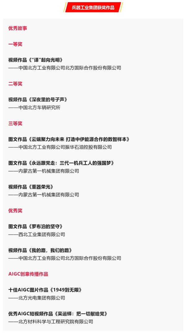 兵器工業(yè)集團(tuán)9件作品在第七屆中央企業(yè)優(yōu)秀故事暨AIGC創(chuàng)意傳播作品發(fā)布展示活動(dòng)中獲獎(jiǎng)